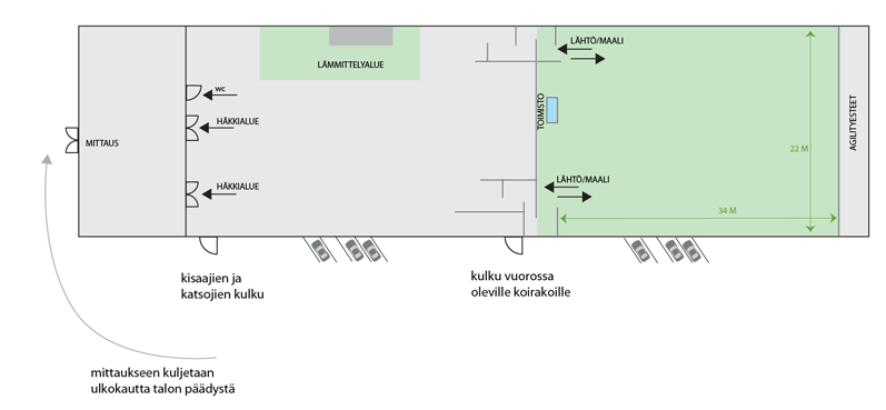 Hallin lämpötila vähintään noin 15°C ja alustana Saltex tekonurmi kumirouhetäytöllä. Kisoissa on käytössä pohjattomat hoopit, jotka on tehty käsityönä ahkerien seuralaistemme toimesta. Tynnyrit ovat valkoisia muovitynnyreitä. Käytössä on yksi pohjaton putki, mutta tuomarin on mahdollista käyttää myös perinteisiä putkia, joita on kaksi kappaletta. Hallista löytyy häkkialue, lämmittelyalue sekä tilaa katsojille.
